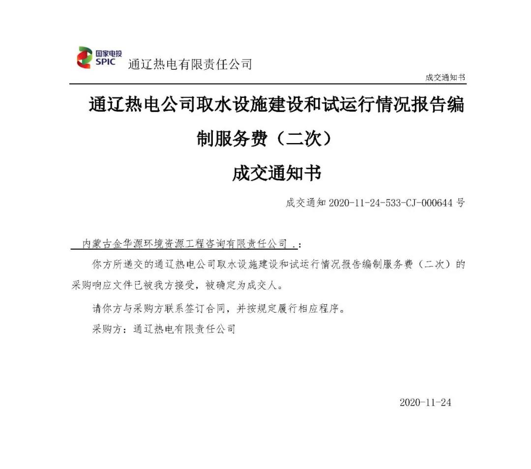 我公司于2020年11月24日,中標通遼熱電有限公司取水設施建設和試運行情況報告編制服務項目。