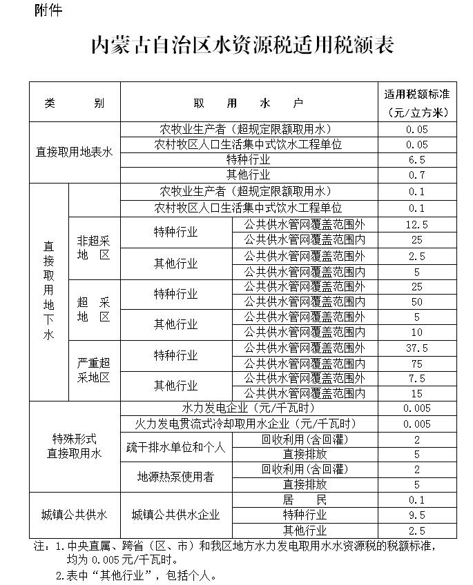 附件:內蒙古自治區水資源稅適用稅額表